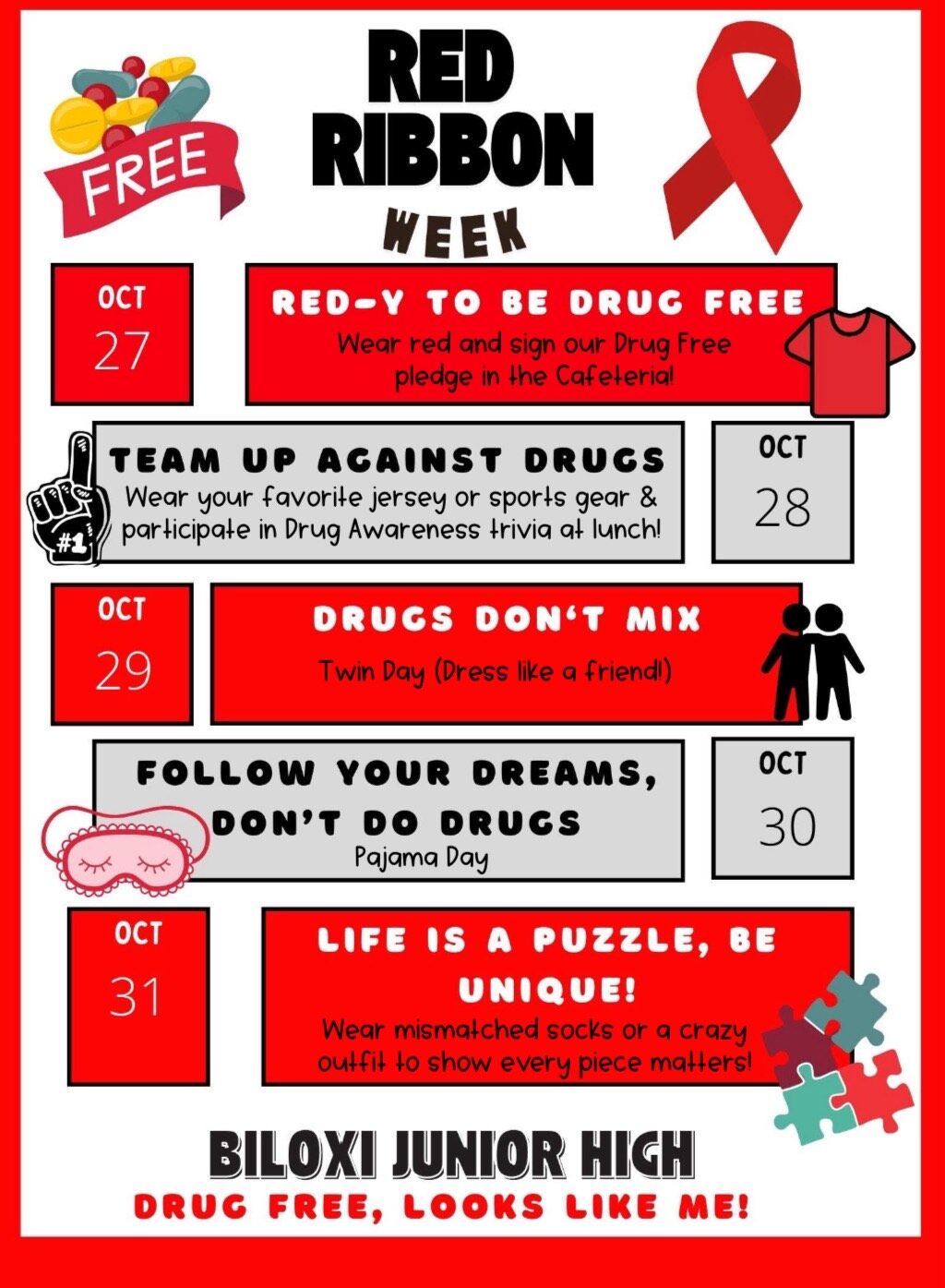 Each day, join in our dress-up themes that remind us to stay drug-free and support one another.