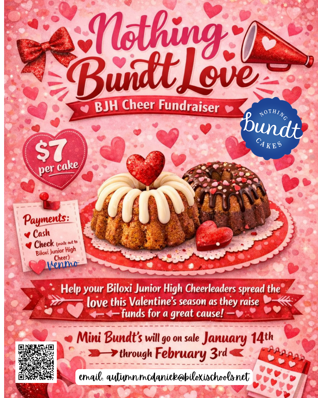 The Biloxi Junior High Cheerleaders have officially launched their Nothing Bundt Love Fundraiser for Valentine’s Day season, and we would love your support. Although the flyer lists January 14, please note that we are currently accepting orders now.